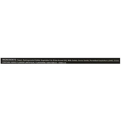 Sugra, hydrogenated edible vegetables fat (palm Karnel oil), milk solids, cocoa solids, permitted emulsifiers (E492, E322)contains added flavour (artifical flavouring substances-Vanilla)