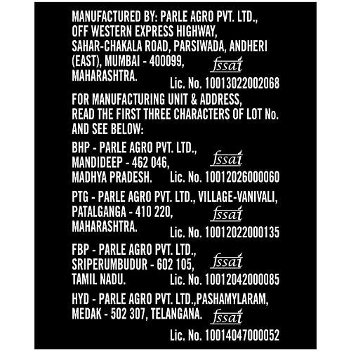 Name and Complete Address of the Manufacturer: Parle Agro Pvt. Ltd., Off Western Express Highway. Sabar-Chakala Road, Parsiwada. Andheri (East), Mumbai 400095, Maharashtra Fssai No.10013022002068