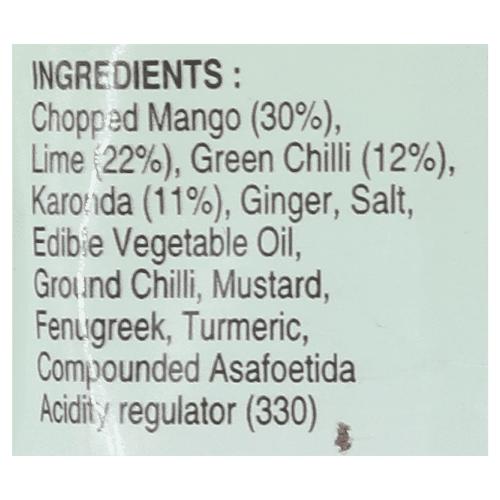 Mangoes, Lime, Green Chilli, Karonda, Ginger, Oil, Salt, Ground Chilli, Mustard, Fenugreek, Turmeric And Compounded Asafoetida.
