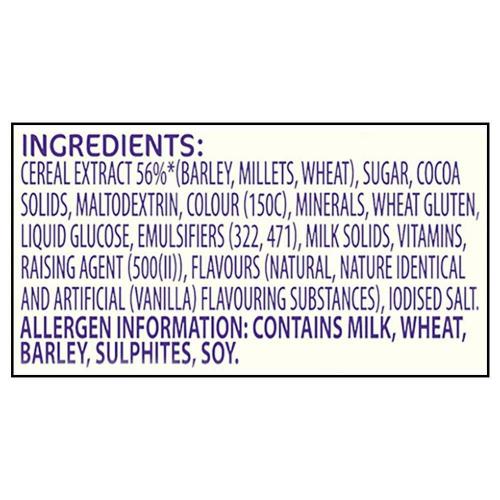 Malt Extract (44%), Sugar, Cocoa Solids, Milk Solids, Liquid Glucose, Emulsifiers (322, 471), Raising agent (500(ii)), Vitamins, Minerals, Salt. Contains Permitted natural colour (150 c) and Added flavour (Artificial (Vanilla) flavouring Substances).