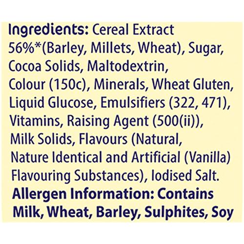 Malt Extract (44%), Sugar, Cocoa Solids, Milk Solids, Liquid Glucose, Emulsifiers (322, 471), Raising agent (500(ii)), Vitamins, Minerals, Salt. Contains Permitted natural colour (150 c) and Added flavour (Artificial (Vanilla) flavouring Substances).