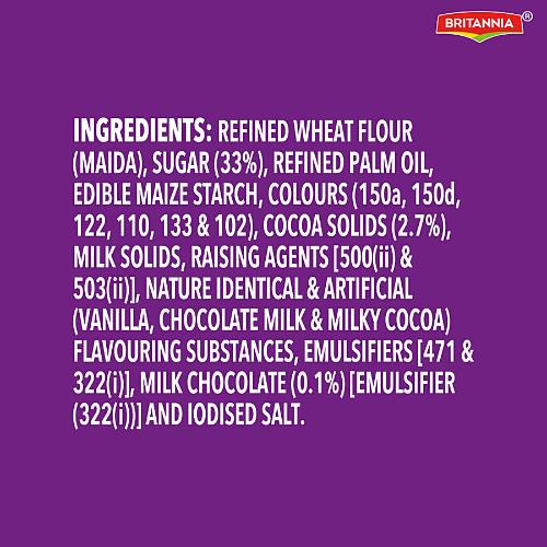Refined wheat flour, Sugar(33%), Edible vegetable oil, Starch, Cocoa Solids(2.5%), Milk Solids, Raising Agents(500(ii), 503(ii)),Solbake(471, 481(i), 270,211), Edible Common Salt and Emulsifier(322).