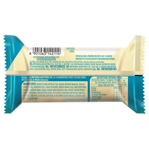 Refined Wheat Flour (38%), Sugar, Edible Vegetable Oil, Rolled Oats (14%), Almond (5%), Wheat Bran (2.7%), Liquid Glucose, Raising Agents [500(ii), 503(ii), 450(i)], Maltodextrin, Oat Fibre (1.6%), Invert Syrup, Milk Solids(0.9%), Emulsifiers (322,471,472e) and Edible Common Salt