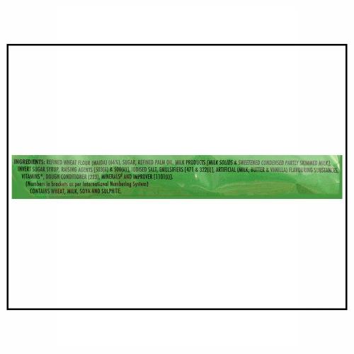 Refined Wheat Flour(58%), Sugar ,Edible Vegetable Oil, Milk Solids, Invert Syrup, Raising Agents, Edible Common Salt, Emulsifiers, Vitamins And Dough Conditioner.