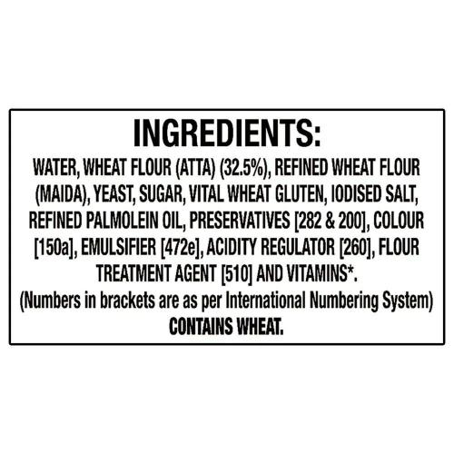 Whole wheat flour, refined wheat flour, yeast, sugar, edible common salt, edible vegetable oil, acidity regulator, flour treatment agents.