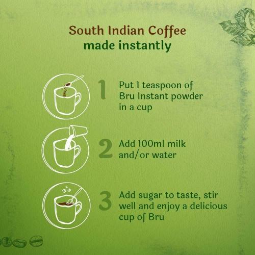 1. Put 1Teaspoon Of Bru Instant Powder In A Cup. 2. Add Hot Water And/Or Milk 3. Add Sugar To Taste, Stir Well & Enjoy A Great Cup Of Bru2. Add Hot Water And/ Milk 3. Add Sugar To Taste, Stir Well & Enjoy A Great Tasting Cup Of Bru.