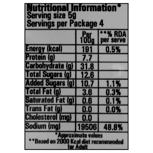 Salt, Mixed Spices (30% (Red chilli, Green Chilli, onion, Cumin, ginger, Coriander)), Sugar, Soy Sauce Powder (soybean, wheat), Disodium 5, Guanylate, Disodium 5, Insoinate (Flavour Enhancers, E627, E631), Sunflower Oil, Caramel (Natural Color, E150d), Citric Acid (Acidifying Agent, E330), Silicon Dioxide (Anticaking Agent, E330) Silicon Dioxide (Anticaking Agent, E551), Acetic Acid (Acidifying Agent, E260).