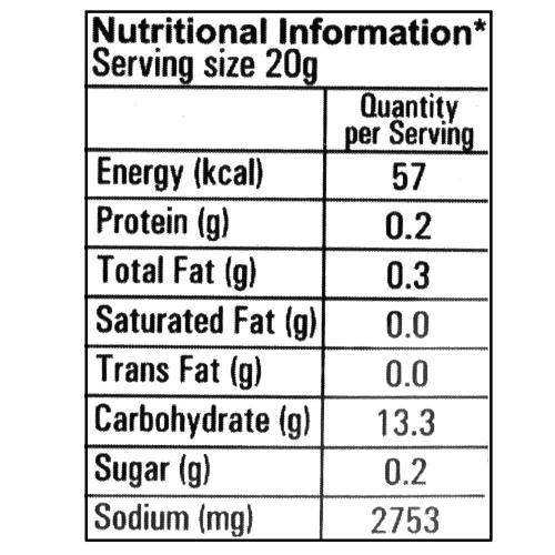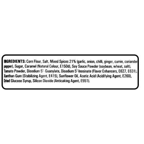 Corn Flour, Salt, Mied Spices (22%), (garlic, onion, red chilli, white pepper, ginger, cumin, coriander, green chilli), Sugar, Caramel (Natural Color, E150d), Soy Sauce Powder, (Soybean Wheat), Tomato Powder, Disodium 5, Guanylate, Disodium 5, Inosinate (Flavour Enhancers, E627, E631), Xanthan Gum (Stabilizing Agent, E415), Sunflower Oil, Silicon Dioxide (Anticaking Agent E551), Acetic Acid (Acidifying Agent, E260), Paprika (Natural Color, E160c).