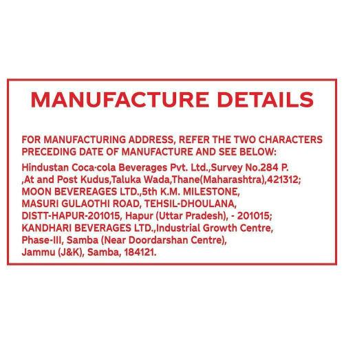 Name and Complete Address of the Manufacturer: Hindustan Coca-Cola Beverages Pvt. Ltd., Survey No. 284-P, Post Kudus, Taluka Wada, District Palghar- 421 312, Maharashtra,Fssai 10012022000261,10020051003319,10018061000352