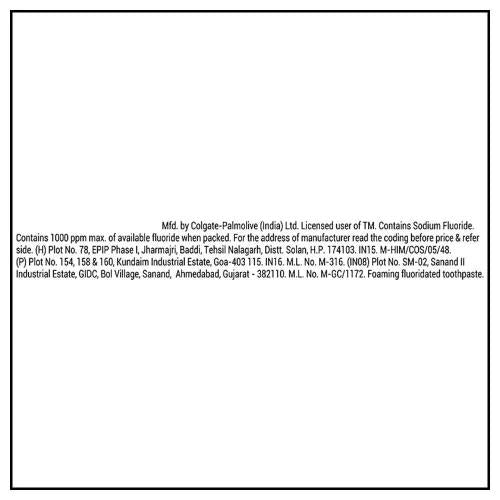 Name and Complete Address of the Manufacturer: Colgate-Palmolive (India) Ltd., (H) Plot No.78,EPIP Phase-I,Jharmajri,Baddi,Tehsil Nalagarh,Distt.Solan,H.P.174103.IN15 M-HIM/COS/05-48 (P)Plot No-158,Kundaim industrial Estate,Goa-403115.IN 16 M.L. No.M-316. (IN08) Plot No.SM-02,Sanand II Industrial Estate,GIDC,Bol Village,Sanand,Ahmedabad,Gujarat-382110. M.L.No-M-GC/1172.& Marketed By : Colgate-Palmolive (India) Ltd., Main Street, Hiranandani Gardens, Powai, Mumbai- 400080