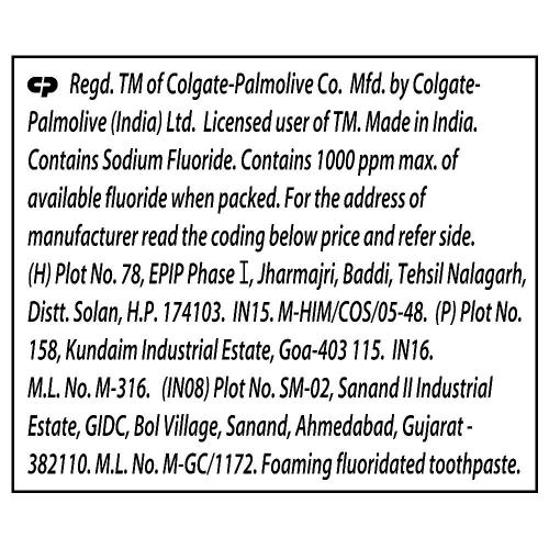 Name and Complete Address of the Manufacturer: Colgate-Palmolive (India) Ltd., (H) Plot No.78,EPIP Phase-I,Jharmajri,Baddi,Tehsil Nalagarh,Distt.Solan,H.P.174103.IN15 M-HIM/COS/05-48 (P)Plot No-158,Kundaim industrial Estate,Goa-403115.IN 16 M.L. No.M-316. (IN08) Plot No.SM-02,Sanand II Industrial Estate,GIDC,Bol Village,Sanand,Ahmedabad,Gujarat-382110. M.L.No-M-GC/1172.& Marketed By : Colgate-Palmolive (India) Ltd., Main Street, Hiranandani Gardens, Powai, Mumbai- 400080