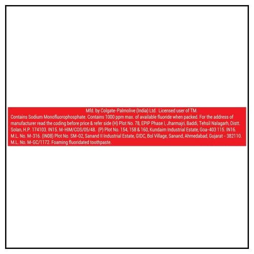 Name and Complete Address of the Manufacturer: Colgate-Palmolive (India) Ltd., (H) Plot No.78,EPIP Phase-I,Jharmajri,Baddi,Tehsil Nalagarh,Distt.Solan,H.P.174103.IN15 M-HIM/COS/05-48 (P)Plot No-158,Kundaim industrial Estate,Goa-403115.IN 16 M.L. No.M-316. (IN08) Plot No.SM-02,Sanand II Industrial Estate,GIDC,Bol Village,Sanand,Ahmedabad,Gujarat-382110. M.L.No-M-GC/1172.& Marketed By : Colgate-Palmolive (India) Ltd., Main Street, Hiranandani Gardens, Powai, Mumbai- 400080