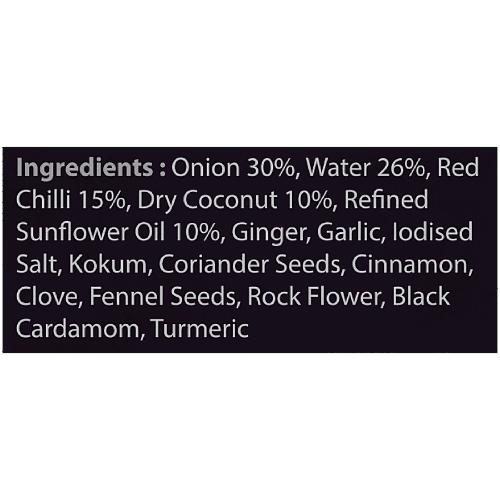 Onion 44%, Refined Sunflower Oil 24%, Water 14%, Ginger, Garlic, Red Chilli, Corriander seeds, Iodized salt, Black Cardamon, Green Cardamon, Cinnamon, Black pepper, Stone Flower, Clove, Caraway Seeds, Dry Coconut, Bay Leaf, Poppy Seeds