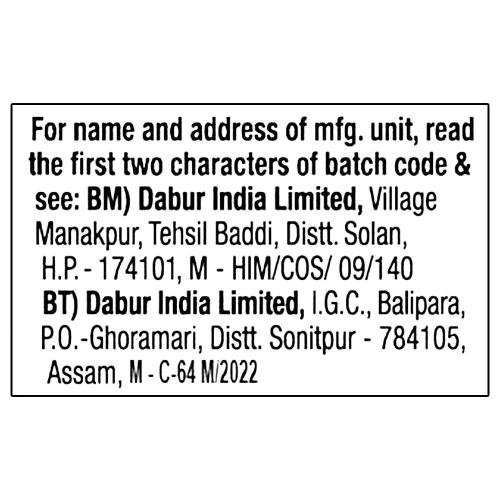 Name and Complete Address of the Manufacturer: Dabur India Ltd. Plot No-22, Site 4, Sahibabad, Sahibabad Industrial Area, Sahibabad Industrial Area, Ghaziabad, Uttar Pradesh 201010