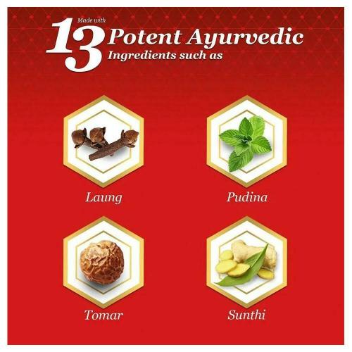 Pudina Satva (Peppermint) containing Menthol (50-55%), Menthyl Acetate and Menthone, Tomar Beej ( Zanthoxylum Armatum) containing Linalool, Limonene, Methyl Cinnamate, Laung Ka Tail (Syzygium Aromaticum) containing Eugenol (70-90%), Shunthi (Zingiber Officinale) containing Sesquiterpenes (50% or more)
