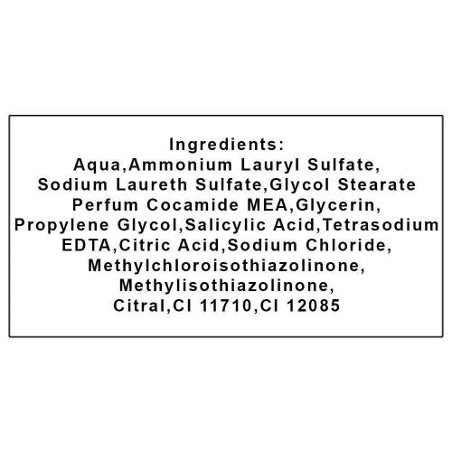 Aqua, Myristic Acid, Lauric Acid, Potassium Hydroxide, Sodium Laureth Sulphate, Glycol Distearate, Potassium Chloride, Cocamide MEA, Palmitic Acid, Cocamidopropyl Betaine, Sodium Chloride, Parfum, Propylene Glycol, Preservatives, Disodium EDTA, Zinc Stearate, Etidronic Acid, p-Chloro-m-cresol.