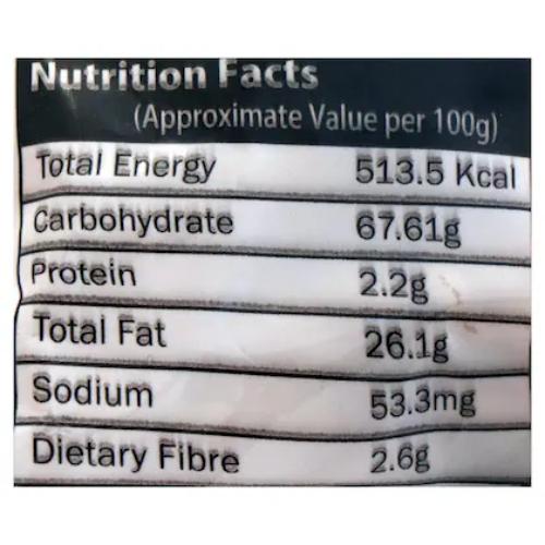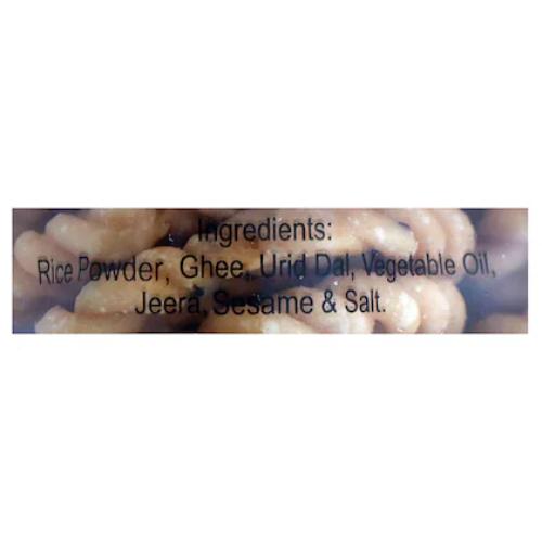 Rice Flour, Edible Vegetable Oil, Chick Peas Flour, Black Gram Flour, Salt, Sesame Seed, Ajawain, Black Pepper & Red Chilli. Contains Gluten. May Contain Peanut, Tree nuts, Soya & Sesame Seed.