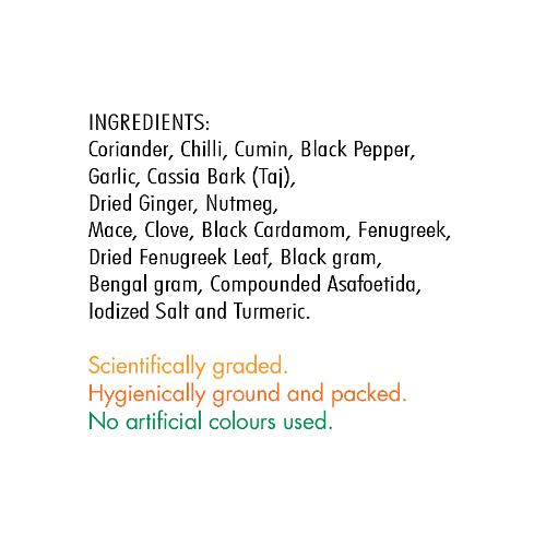 Coriander, Chilli, Cumin, Black Pepper, Garlic, Cassia, Dry Ginger, Nutmeg, Mace, Clove, Black Cardamom, Cardamom Seeds, Fenugreek, Poppy Seeds, Dry Fenugreek Leaf, Black Gram, Bengal Gram, Asafoetida, Common Salt and Turmeric.