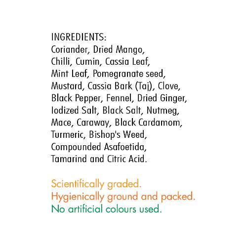 Coriander, Red Chilli, Cumin, Black Pepper, Cinnamon Leaves, Dry Mango, Clove Sticks, Iodised Salt, Onion, Kasuri Methi, Turmeric, Dry Ginger, Kachadi, Garlic, Star Aniseed, Sesame Seeds, Big Cardamom, Cardamom, Black Cumin