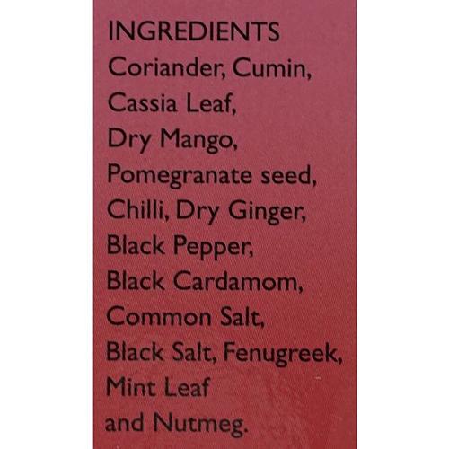 Coriander, Cumin, Dry Mango, Dry Ginger, Black Pepper, Pomegranate Seeds, Black Cardamom, Common Salt, Cassia Leaves, Nutmeg, Cloves.
