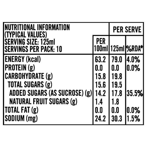 Water, Mango Pulp, Sugar, Acidity regulator (330), Antioxidant (300).