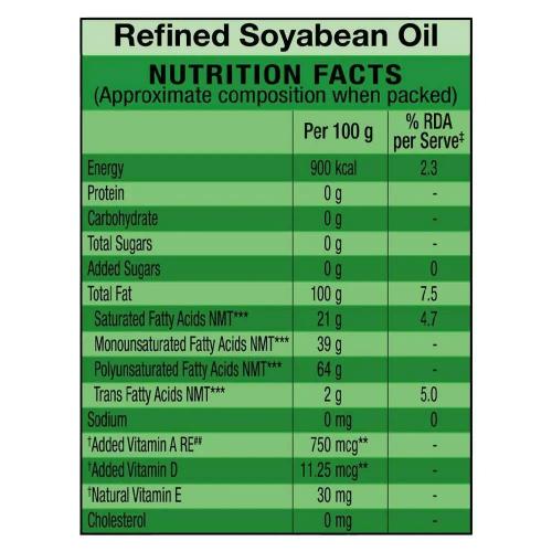 Soyabean oil, Vitamin A 750 mcg per 100g oil, Vitamin E 273 mcg per 100g Oil, Vitamin D 5 mcg per 100g Oil. Dimenthyl polysiloxane (900a) - 5ppm