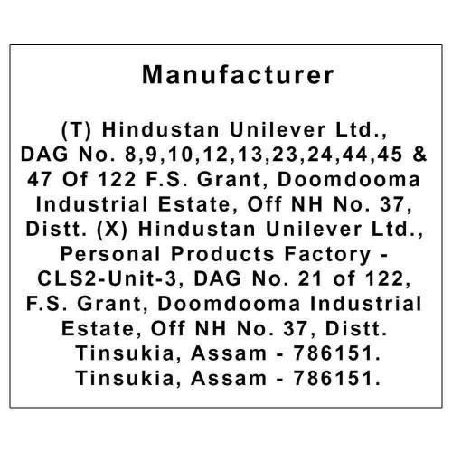 Name and Complete Address of the Manufacturer: Hindustan Unilever Limited Hindustan Unilever Ltd, Unilever House, B D Sawant Marg, Chakala Andheri East - 400099