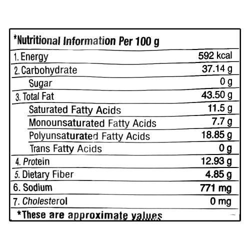 Tapary Beans Flour (Moth), Edible Vegetable Oil, Chick peas Flour, Salt, Red Chilli Powder, Clove Powder, Black Pepper, Dried Ginger Powder, Cardamom, Bay Leaves, Nutmeg & Cinnamon. May Contain Peanut, Tree nuts, Gluten & Sesame Seed.