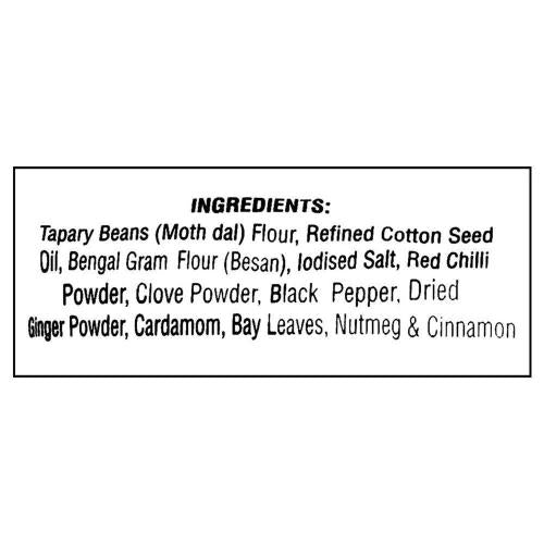 Tapary Beans Flour (Moth), Edible Vegetable Oil, Chick peas Flour, Salt, Red Chilli Powder, Clove Powder, Black Pepper, Dried Ginger Powder, Cardamom, Bay Leaves, Nutmeg & Cinnamon. May Contain Peanut, Tree nuts, Gluten & Sesame Seed.