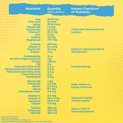This food powder, is formulated with key ingredients like DHA, Choline (these boost and support optimal brain development), high quality protein and other nutrients required for favourable weight gain for the kid.The product also boosts immunity and ensures an overall healthy growth and development of the child.