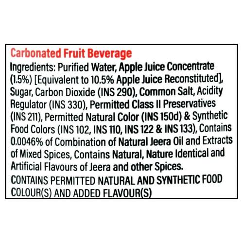Carbonated water, sugar, salt, natural identical flavouring substances, permitted natural color, jeera masala