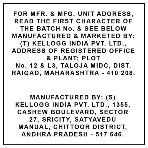 Name and Complete Address of the Manufacturer: Kelloggs India Limited Plot L2 ,L3, Taloja Midc, Dist Raigad, Maharshtra 410208, Fssai No.10013022002031.10014044000876