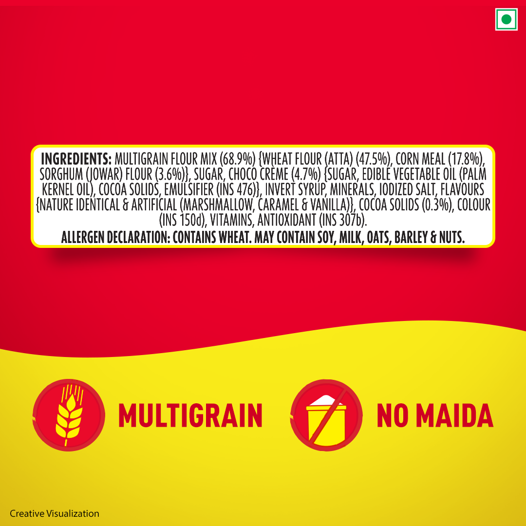 Wheat Solids (41%), Sugar, Corn Flour, Wheat Bran, Choco Creme (5.2%), {Sugar, Edible Vegetable Oil (Palm Kernel Oil), Cocoa Solids (0.3%), Minerals, Vitamins, Colour (Ins 150D), Antioxidant (Ins 320), Permitted Natural Marshmallow & Vanilla Flavoring Identical & Substances