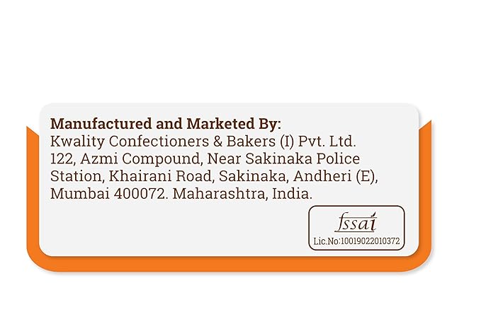 Name and Complete Address of the Manufacturer: Kwality Confectioners And Bakers (I) Pvt. Ltd., 122 Azmi Compound Khairani Rd, Near Sakinaka Police Station Chandivali, Mumbai, Maharashtra - 400072,Fssai No.10019022010372