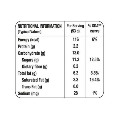 Energy 119kcal, protein 2.2g, carb 14.0g, sugars 11.2g, dietary fibre 2.6g, total fat 5.7g, saturated fat 3.5g, trans fat 0.1g, sodium 27mg.