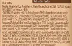 Mixed spices (35.2%) ^Roasted spice powder (9%) (Coriander (2.7%), Turmeric (2.3%), Cumin (1.1%), Aniseed (0.9%), Black pepper (0.6%), Fenugreek (0.5%), Ginger (0.5%), Clove (0.2%), Green cardamom (0.2%), Nutmeg (0.2%)), Dehydrated onion, Red chilli powder (4.5%), Dried garlic (4%), Red chilli bits (3%), Black pepper powder (1.5%), Coriander powder (1.4%), Turmeric powder (1.2%), Dried ginger powder (1%), Aniseed powder (0.8%), Cumin powder (0.7), ^Roasted cumin (0.5%), Fenugreek powder (0.4%), ^Roasted garam masala powder (0.4%) (Cinnamon (0.2%), Bay leaf (0.1 %), Green cardamom (0.1%), Black pepper (0.02%), Large cardamom), Compounded Asafoetida (Refined wheat flour (Maida), Carrier (414), Asafoetida), Spice extract blend (Capsicum extract, Coriander extract (0.001%), Cumin extract (0.001 %)), Star anise powder (0.3%)] , Sugar, Toasted onion (Onion, Corn oil), Corn savoury powder (Corn starch Iodised Salt, Yeast extract), Yeast extract powder (Yeast extract Salt), Iodised salt Noodle powder (Refined wheat flour (Maida), Palm oil, Iodised salt, Gluten, Thickener (508), Acidity regulators (501(i), 500 (i)), Humectant (451(i)), Thickener (412)), Salt substitute (Potassium chloride), Dehydrated kasuri methi leaves, Edible starch, Palm oil, Thickener (508), Acidity regulator (330) and Mineral (Ferric pyrophosphate).