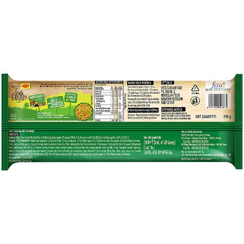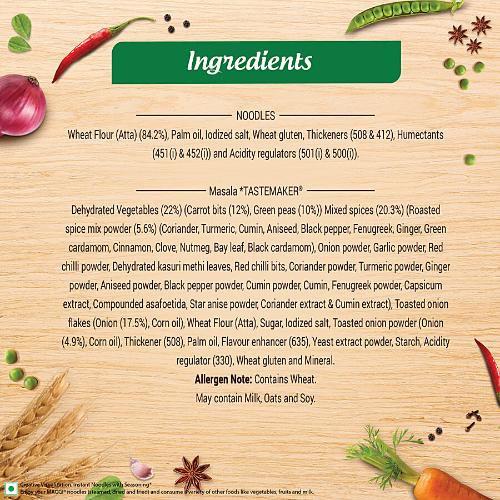 NOODLES: Alla (85%), Palm oil, Salt, Thickeners (508 & 41 2), Acidity regulators (500(i) & 501 (i)) and Humectant (451 (i)). Masala TASTEMAKER with garnishing: Sugar, Onion (1 2, 7%), Hydrolysed groundnut (peanut) pro- tein, Noodle powder (Wheat flour, Palm oil, Salt, Wheat gluten, Stabilizer (1 70(i)), Thickeners (508 & 412), Acidity regulators (500(i) & 501(i)) and Humectant (451(i))), Green peas (7.7%), French beans (6.6%), Carrot (6.6%), Coriander seeds, Salt, Turmeric, Chilli (2.3%), Palm oil, Garlic (2%), Coriander leaves, Cumin, Thickener (508), Colour (1 SOd), Black pepper (0.9%), Aniseed, Acidity regulator (330), Flavour enhancer (635), Fenugreek, Ginger, Clove (0.2%), Nutmeg, Green