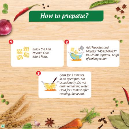 NOODLES: Alla (85%), Palm oil, Salt, Thickeners (508 & 41 2), Acidity regulators (500(i) & 501 (i)) and Humectant (451 (i)). Masala TASTEMAKER with garnishing: Sugar, Onion (1 2, 7%), Hydrolysed groundnut (peanut) pro- tein, Noodle powder (Wheat flour, Palm oil, Salt, Wheat gluten, Stabilizer (1 70(i)), Thickeners (508 & 412), Acidity regulators (500(i) & 501(i)) and Humectant (451(i))), Green peas (7.7%), French beans (6.6%), Carrot (6.6%), Coriander seeds, Salt, Turmeric, Chilli (2.3%), Palm oil, Garlic (2%), Coriander leaves, Cumin, Thickener (508), Colour (1 SOd), Black pepper (0.9%), Aniseed, Acidity regulator (330), Flavour enhancer (635), Fenugreek, Ginger, Clove (0.2%), Nutmeg, Green