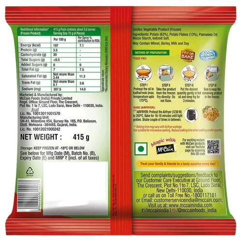 Name and Complete Address of the Manufacturer: Mc Cain Foods India Pvt Ltd, SH - 41, P.O. Baliasan, Mehsana - 382732, Gujarat, India FSSAI 10012021000242,FSSAI 10013011001570
