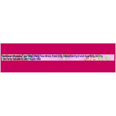 Sugar, Liquid Glucose. Fruit juice (2%), Acidity Regulator (INS 330), Starch. Hydrogenated Vegetable Oil, Gum Arabic, Stabilizer (INS 1400). Emulsifier (INS 471) Contains Permitted Synthetic Food Colour (INS 127) and Added Nature - Identical (strawberry) flavouring substances