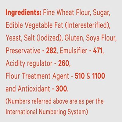 Fine wheat flour, Sugar, Edible vegetable fat, Yeast, Salt, Gluten, Soya flour, Flour treatment agent, Acidity regulator and antioxidant.