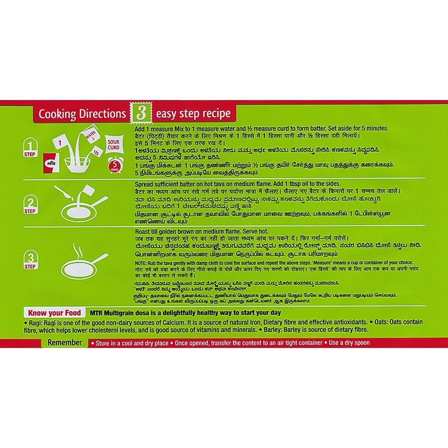 Multigrain Flour (32.2% of which is Corn, Ragi, Barley& Oats), Rice, Blackgram flour, Refined Wheat Flour, Rice Flakes, Edible Vegetable Fat, Salt, Raising Agent (INS 500 ii), Acidity Regulator(INS 296), Fenugreek.