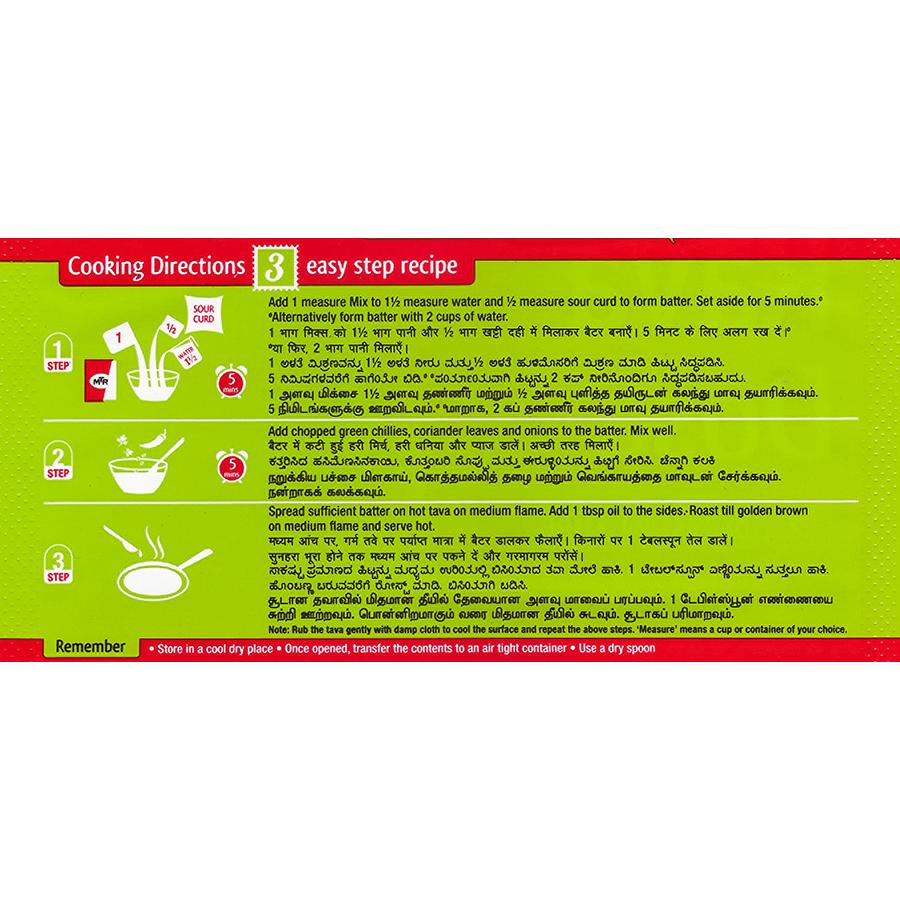 Add 1 cup of Mix to 1 ½ cups water and ½ cup sour curd to form batter. Set aside for 5 minutes. Add chopped green chillies, coriander leaves and onions to the batter. Mix well. Spread sufficient batter on hot tava on medium flame. Add 1 tbsp. oil to the sides. Roast till golden brown. Serve hot