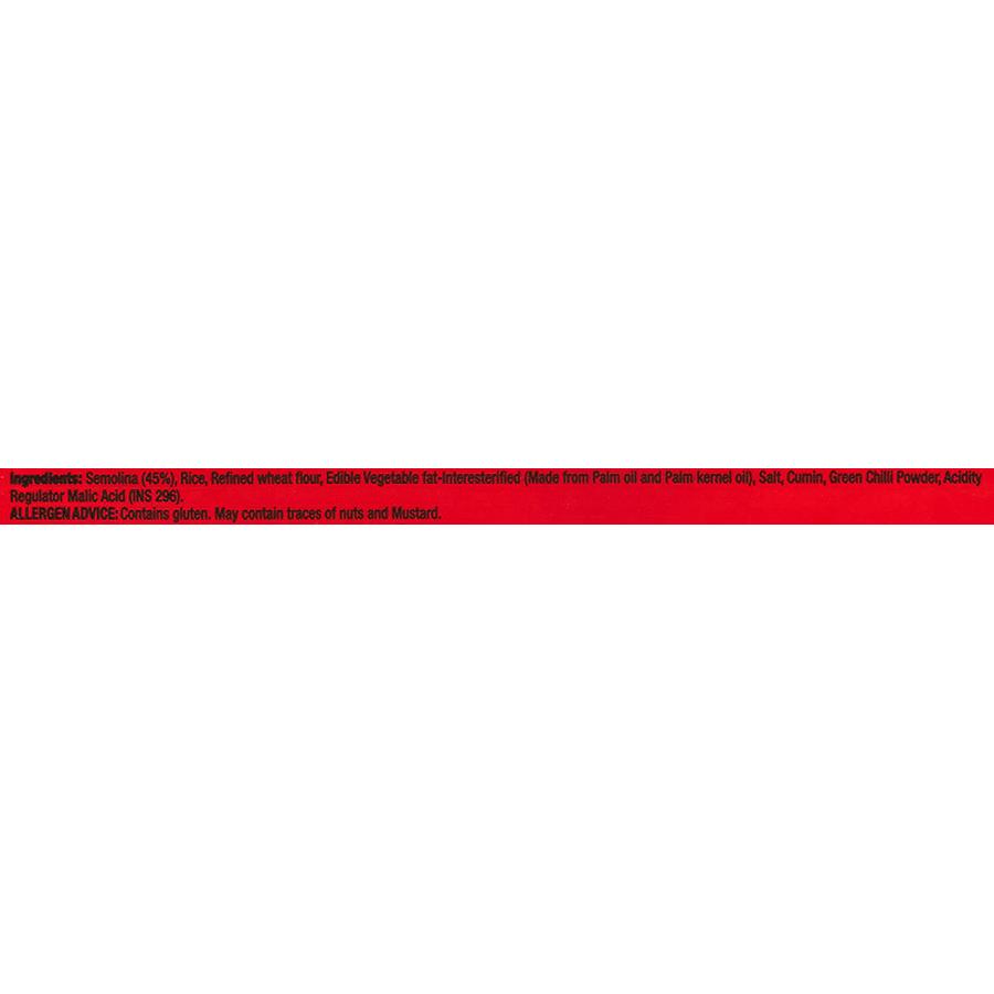 Semolina (45%), Rice, Maida, Edible vegetable fat, Salt, Cumin, Acidity Regulator (INS 296), Green Chilli Powder