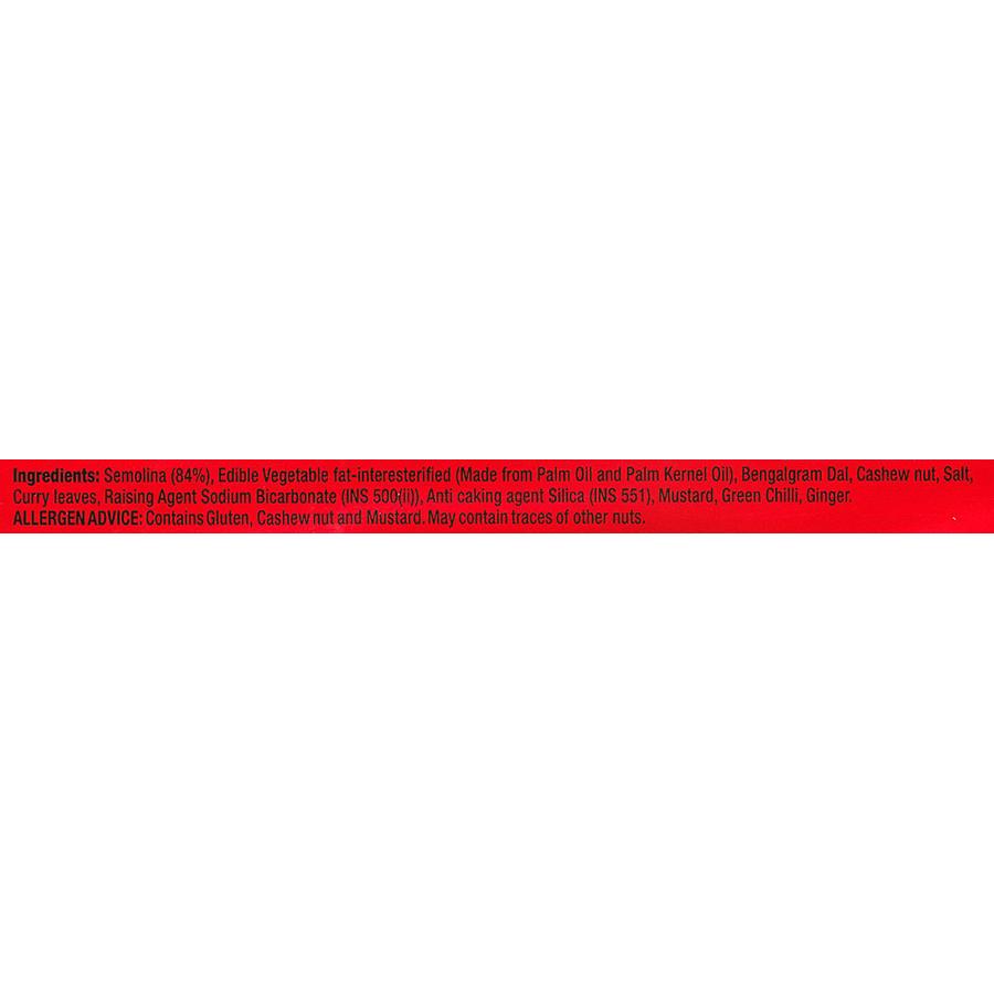 Semolina (84%), Edible vegetable fat, Bengal gram dal, Cashew nut, Salt, Curry leaves, Raising Agent (INS 500 ii), Mustard, Green Chilli, Ginger, Anti caking agent (INS 551).