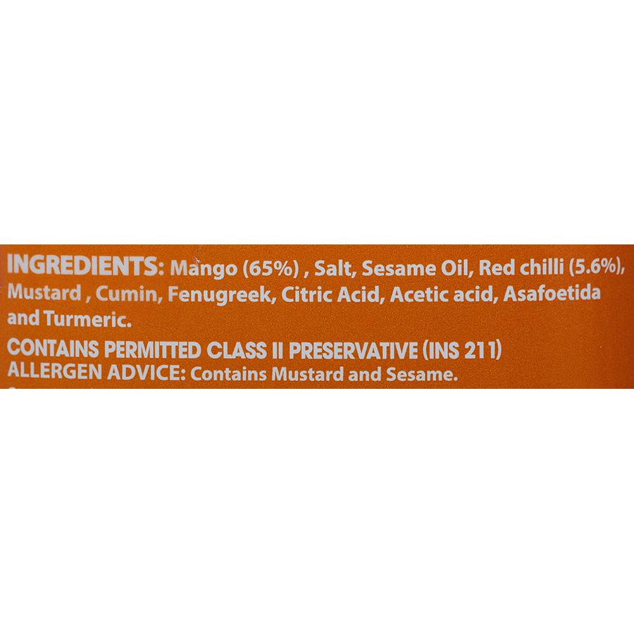 Mango (48%), Salt, Edible Vegetable oil, Red chilli powder (5%), Mustard, Garlic, Fenugreek, Cumin, Turmeric powder, Acetic acid, Asafoetida.