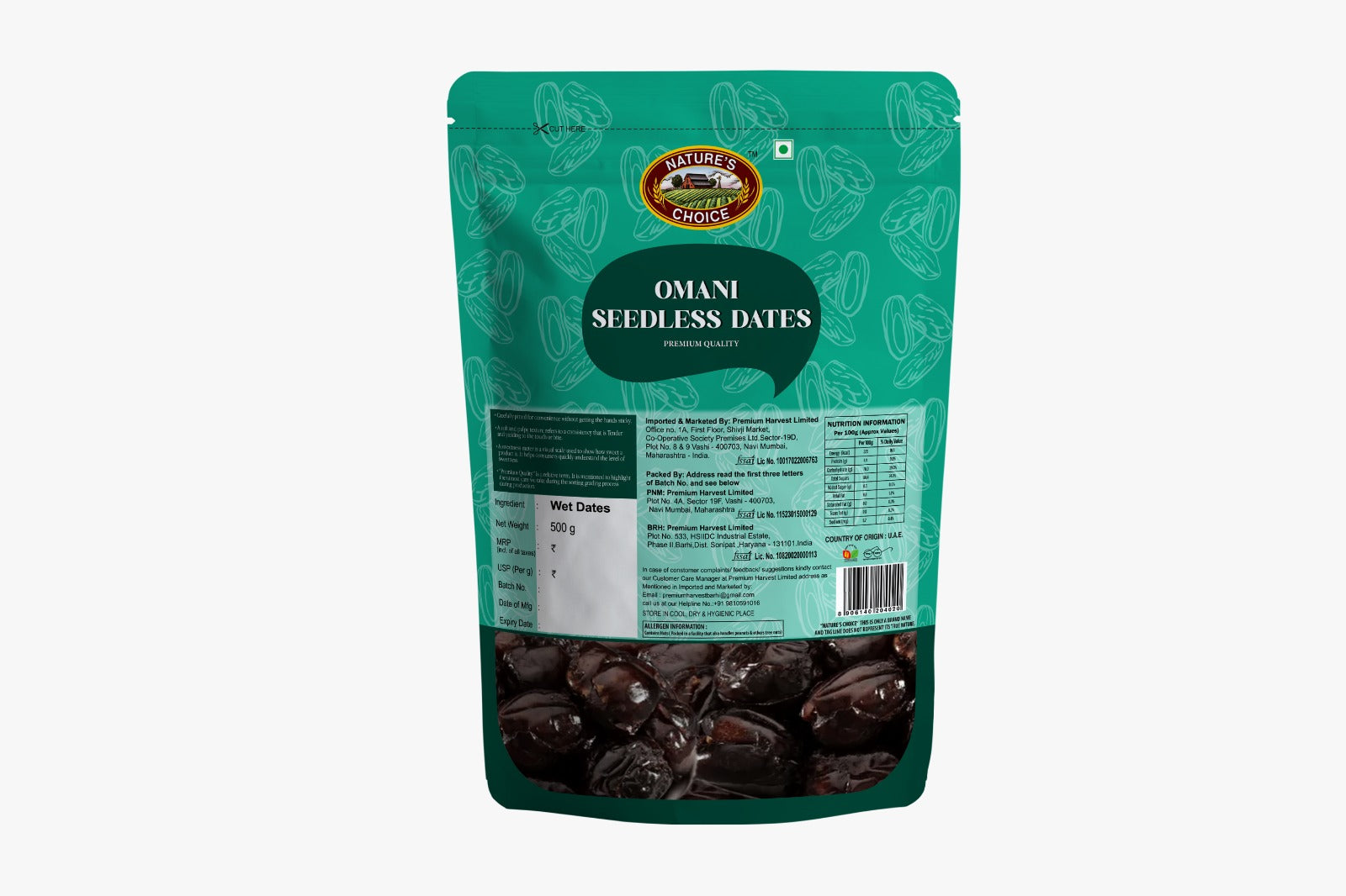 Name and Complete Address of the Manufacturer: Shree Ganesh Dryfruits Sambhaji Chowk,Pradhikaran Pune-Pin Code:411044 Fssai No.10018022008100,Premium Harvest Limited Sector 19D, Vashi Navi Mumbai-Pin Code:400703 Fssai No.10820020000113,Ofb Tech Pvt Ltd New Delhi-Pin Code:110016 Fssai No.10016022005363