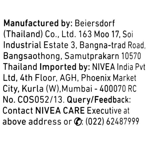 Name and Complete Address of the Manufacturer: Nivea India Pvt. Ltd. 4thFloor Art Guild House, Phoenix Marketi City, Kurla West, Mumbai 400070