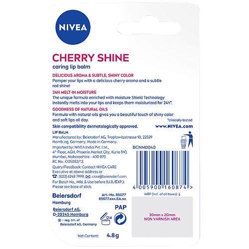 Nivea Lip Care Cherry Kiss is light weight and absorbs quickly.It protects your lips from getting chapped and gives a glossy shine. It provides long lasting moisture to your lips. It protects your lips from harmful UV rays.