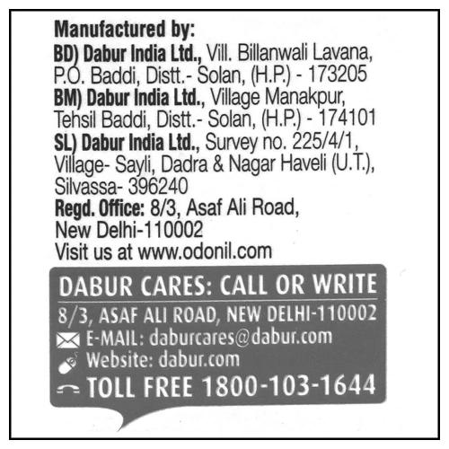 Name and Complete Address of the Manufacturer: Dabur India Limited Registered Office: 8/3, Asaf Ali Road, New Delhi-110002